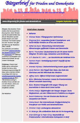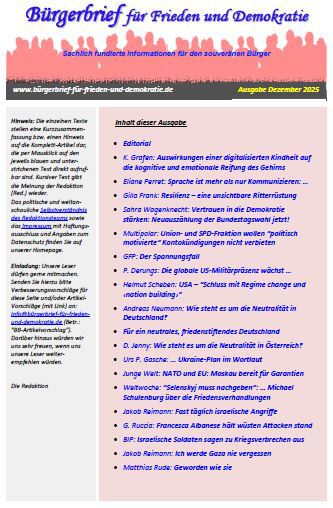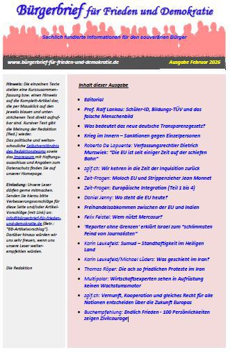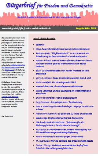 Die auf dieser Homepage monatlich erscheinenden Bürgerbriefe sollen durch sachlich fundierte Informationen dazu beitragen, dass sich jeder Bürger ein eigenes Bild und eine eigene Meinung zum aktuellen Weltgeschehen machen kann.
